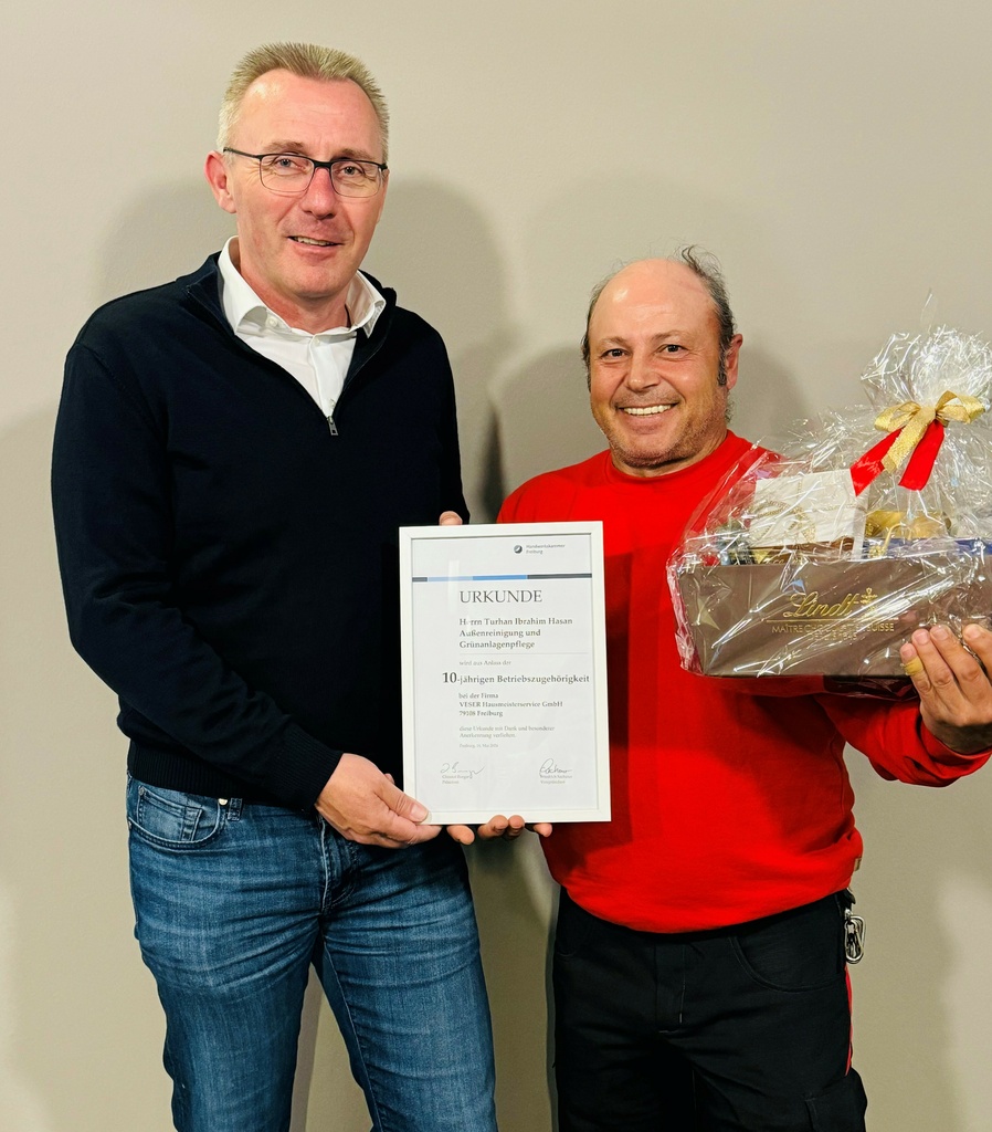 Gestern, am 14.05.2024 hatte unser Mitarbeiter Turhan Ibrahim Hasan sein 10-jähriges Jubiläum als Mitarbeiter im Bereich Außenreinigung und Grünanlagenpflege. Wir gratulieren ihm ganz herzlich zu diesem Jubiläum und bedanken uns für die Treue und vertrauensvolle Zusammenarbeit. Für die kommende Zeit wünschen wir Herrn Hasan vor allem Gesundheit, Erfolg und freuen uns auf noch viele weitere Jahre zusammen mit ihm.